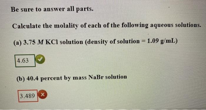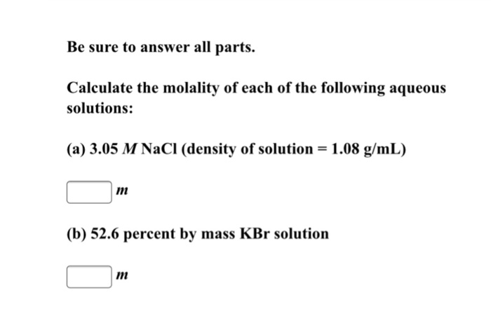 Solved Be Sure To Answer All Parts Calculate The Molality Chegg Com